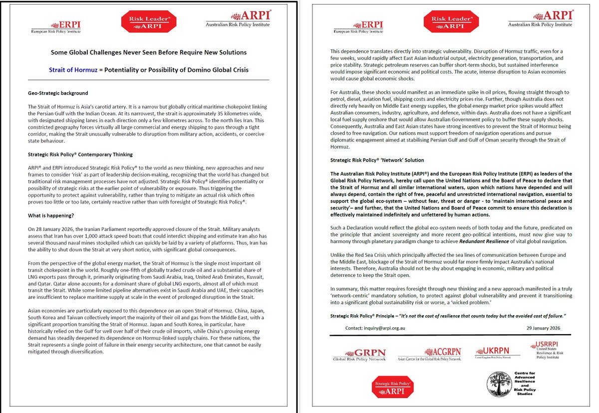 The Australian Risk Policy Institute® is a non-political and non-profit organisation formed to promote and encourage greater focus on Strategic Risk Policy® in leadership, decision-making, public policy and management across all sectors in Australia.